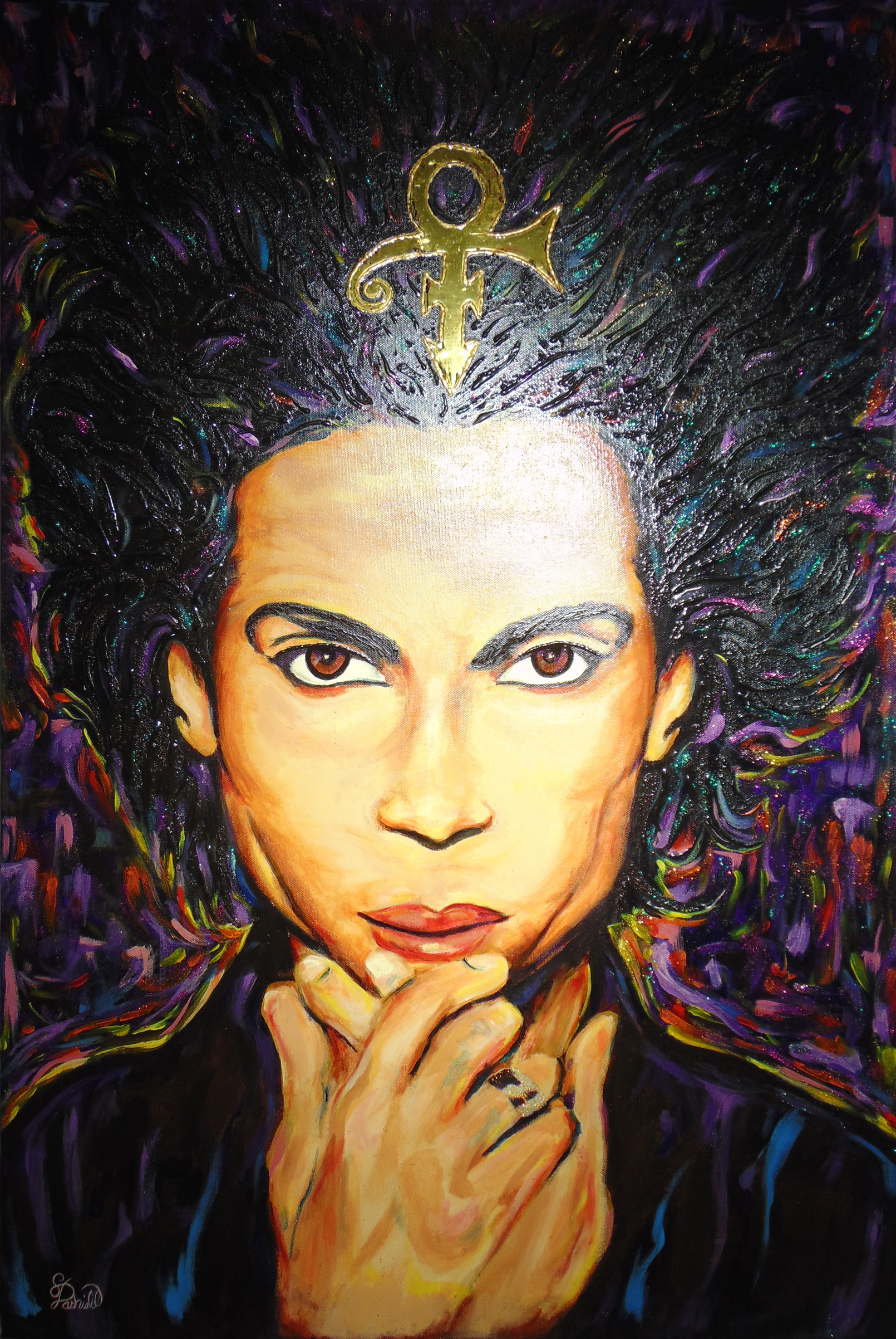 Sign of Prince Acrylic on canvas - 24" x 36" Portrait of the artist Prince Busy Bird Acrylic on canvas - 24" x 24" Colorful hummingbird and flower scene Like Me Oil on canvas - 36" x 24" African child admiring a butterfly on a stick.